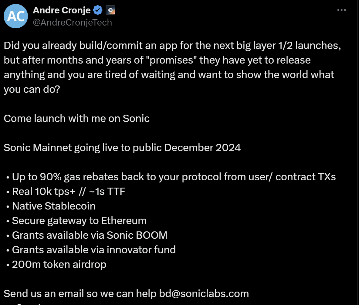 改名不仅仅带来新的品牌重塑,比起许多国库充足但却持续「装死」的 L1,Fantom 基金会和 AC 对于重振 Fantom 生态表现出更加积极的态度并采取了行动。Andre Cronje 本人也在回归后经常在 X 更新关于 Sonic 的 Roadmap 以及进度,对 Sonic 格外上心。