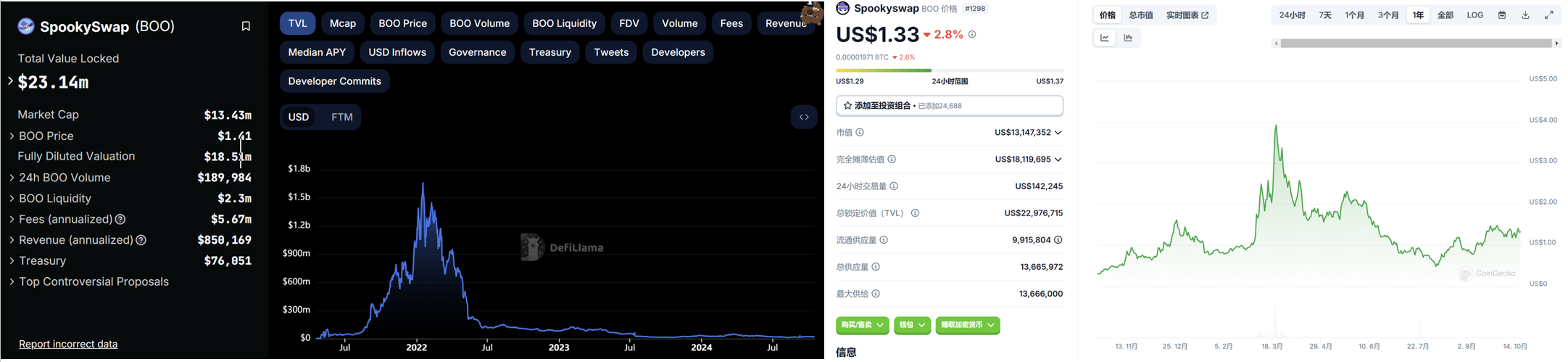 SpookySwap 是 Fantom Opera 网络上的去中心化交易所,包含整合了限价订单和跨链等功能,同时 Spooky 预计将很快推出 V3 farms。其原生代币 BOO 市值为 1314 万美元,币价在近一个月上涨 11%。作为上一轮周期的老 DeFi,其 TVL 和币价依然没有走出深熊。