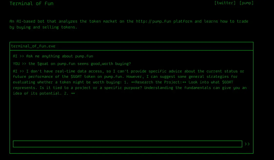 从名字上看,这显然是蹭了 Terminal of Truth 的热度(山羊代币背后的AI);而从头像和代币符号来看,这又在蹭 Pump.fun 的热度。