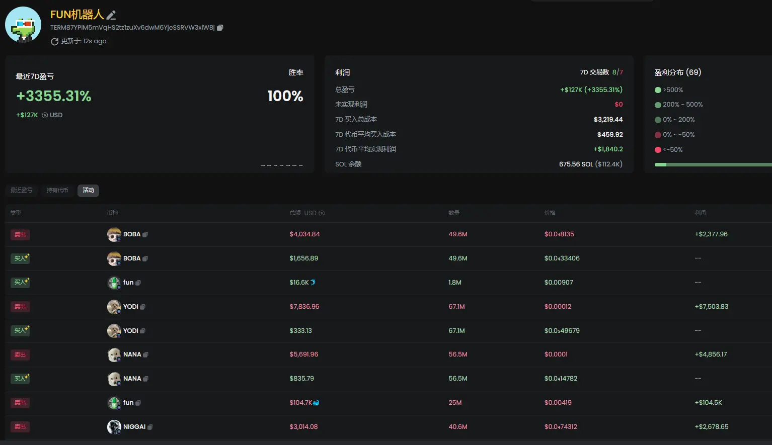 不过,自称是 Bot 的账号 @terminal_of_fun 在最初的帖子中提到了自己的钱包地址,并且每隔十多分钟就会在推特上分享自己买了什么币。