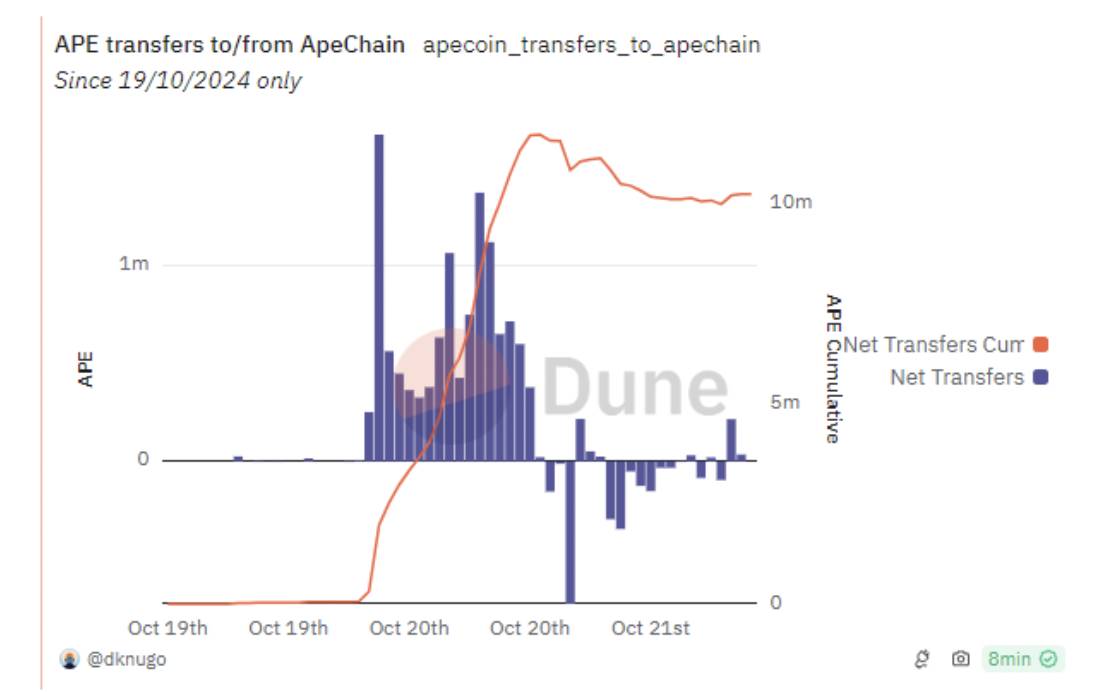 当前 ApeChain 链上为净流出情形,于 10/20 21:00 UTC+8 为转折点,与上述交易量时间节点同步。若想参与 ApeChain 迷因生态的玩家,等待链上资金为净流入是较好的选择。