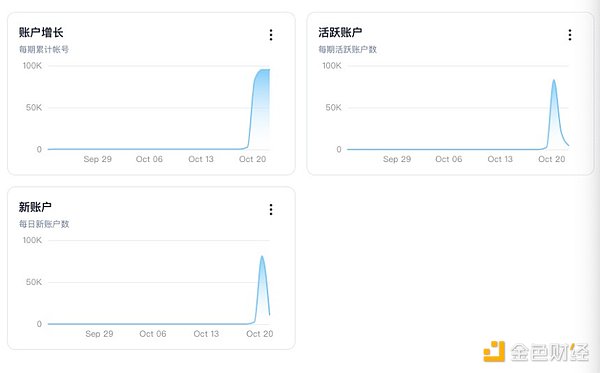 10月20日,是Ape Express热度最高的时刻,根据Ape Express自己提供的数据统计可以看到,新用户和活跃用户均在10月20日达到指数级增长,然后就迅速回落。