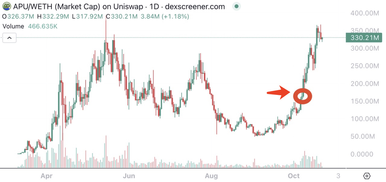 接连踩中大金狗,让 Moonshot 开始真的有了「上币效应」。meme 币项目方也希望能够在 Moonshot 上列出。以太坊上的 meme 币 APU 自 9 月初开始从市值 6000 万美元左右启动上涨。涨幅约 2.5 倍、市值至 1.5 亿美元左右时,APU 于 10 月 6 日宣布为登上 Moonshot,将通过 Wormhole 从以太坊跨链到 Solana 链上。之后,APU 持续拉升,截至撰稿时市值为 3.3 亿美元。