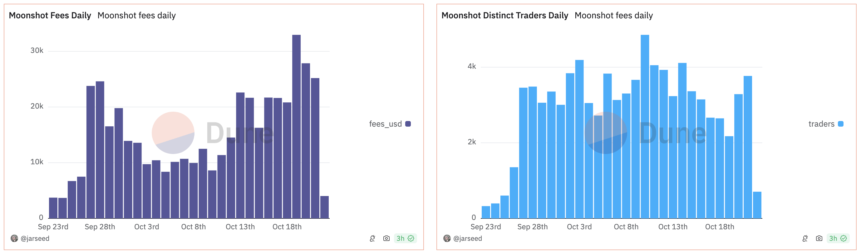 尽管与 MOODENG 的「相互成就」让 Moonshot 迎来了飞速发展,日费用从 9 月底的 3700 美元迅速上涨至上周末的 3.2 万美元,日交易用户数也从三百多名涨至平均近 4000 名。但自从 MOODENG 之后,Moonshot 的用户数并没有明显增长,日费用还经历了阶段性滑坡。在情绪主导的 meme 市场,Moonshot 带给 meme 的,是比交易量更重要的热度。