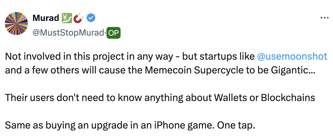 Moonshot 上线于 7 月 18 日,上线后不到一周,还没有在 Token 2049 上发表 meme 超级周期演讲的 Murad 就专门发推介绍了 Moonshot,并附上了 Moonshot 的交互演示视频。「我没有以任何方式参与这个项目,但像 Moonshot 这样的初创公司将推动 Memecoin 超级周期变得更加庞大,他们的用户不需要了解有关钱包或区块链的任何知识,只需一次点击,就像付费升级 iPhone 游戏一样。」