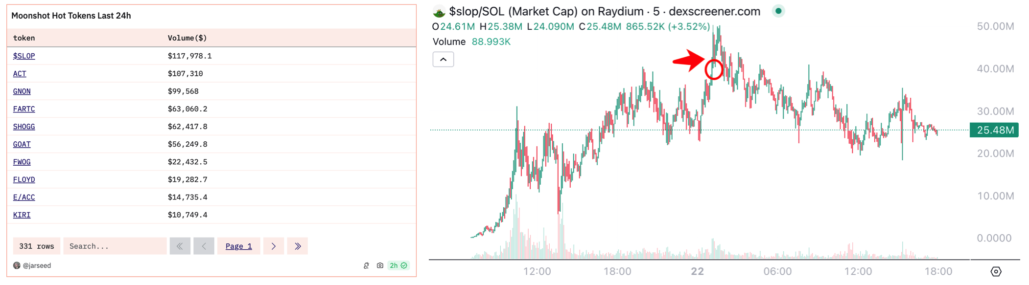 从走线上可以看出,上线 Moonshot 消息后,slop 半小时涨幅近 20%,但触及 5000 万美元市值后开始下跌,目前市值为 2548 万美元,据高点接近腰斩。