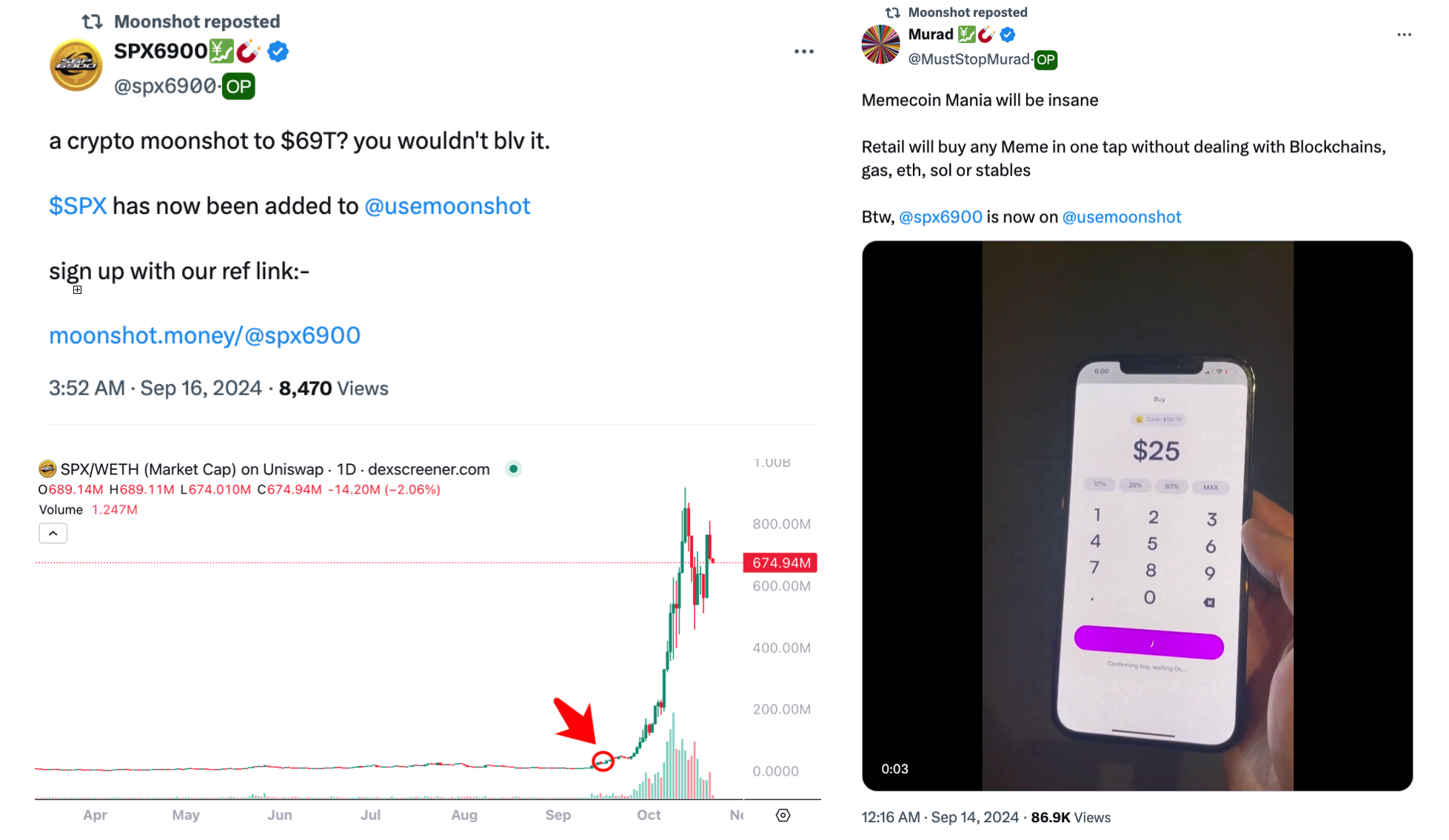 MOODENG 推动 Moonshot「出圈」之时,Murad 正在新加坡的 Token2049 大会上发表他的「memecoin supercycle」超级演讲,并为$SPX6900 喊单。自 9 月初开始,SPX6900 用一个月的时间,市值从不到 900 万美元涨至 9 亿美元,而早在 Murad 发表演讲之前,Moonshot 就已经列出了 SPX6900,当时的市值还不到 3000 万美元。