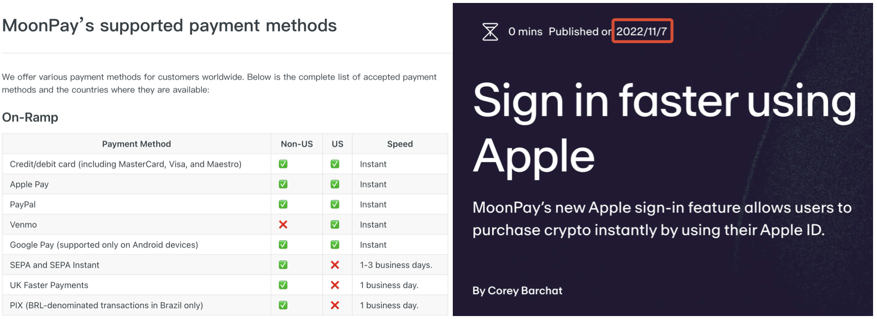 后者 MoonPay 的费用收取机制详见官方说明,使用 PayPal 购买的出入金手续费分别为 4.5% 和 3.4%。而 Apple Pay 的支付功能,MoonPay 早在 2022 年就开始探索了。