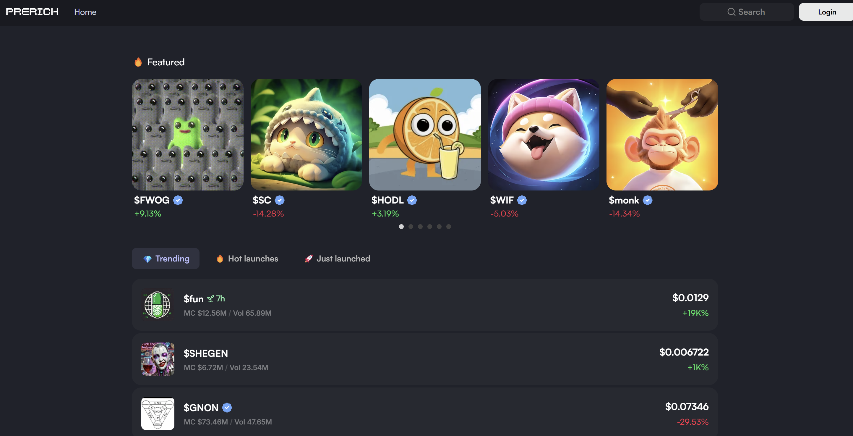 Prerich 是一款简化链上交易的应用程序,提出了和 moonshot 类似的「Buy memecoins with ease!」的口号。Prerich 提供类似于 Robinhood 的用户友好界面,支持用户进行快速高效地链上交易。用户也可以用邮箱和信用卡登录。Prerich 独特的 meme 设计界面也成为吸引社区用户的因素之一。