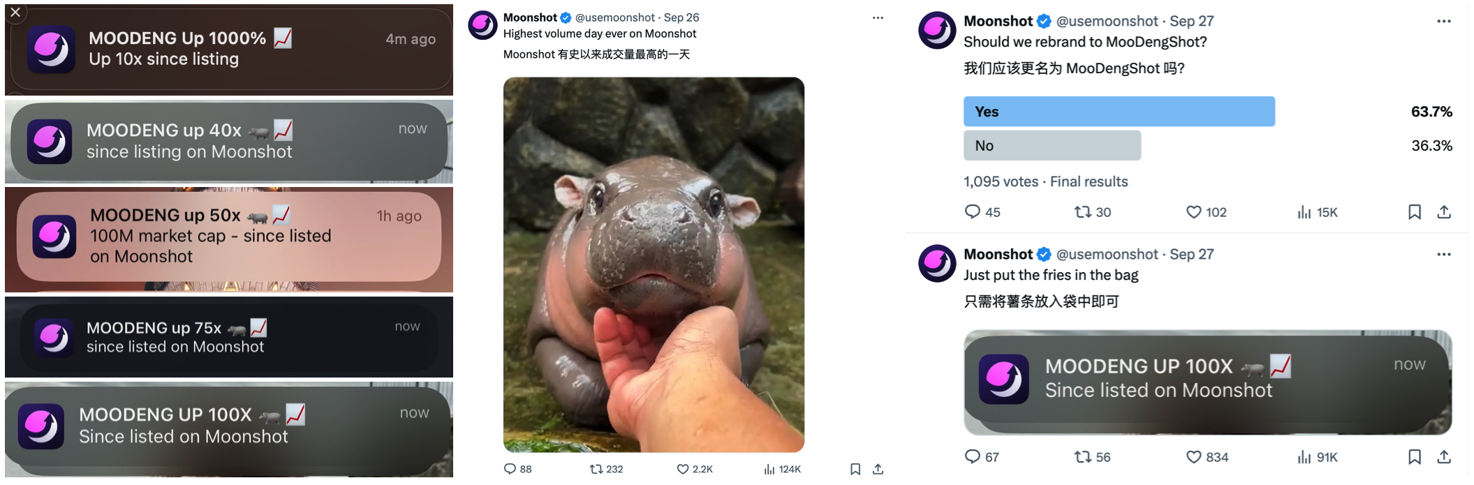 Moonshot 推出之初上线了许多代币,但影响力并没有出圈,直到遇见市值还未大幅拉升的 MOODENG。上线 MOODENG 时,Moonshot 没有专门为其发布推文。在 MOODENG 持续上涨后,官推所转发的「上币后涨幅」不断更新,9 月 26 日,Moonshot 发布推文「Moonshot 有史以来成交量最高的一天」并配文 MOODENG 河马的表情包。