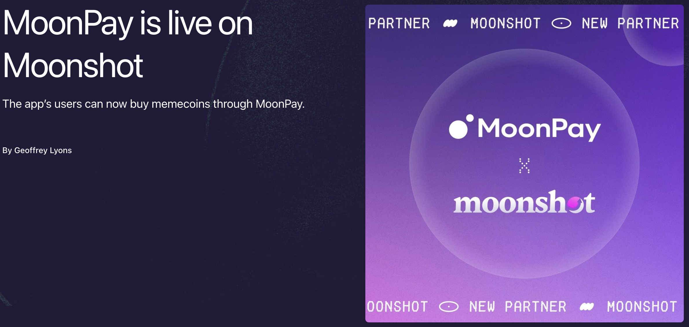 Moonshot 上线次日,就与 MoonPay 达成了合作,Moonshot 的「法币购买、Applepay 支付」等产品亮点全部得益于 MoonPay 的功能。