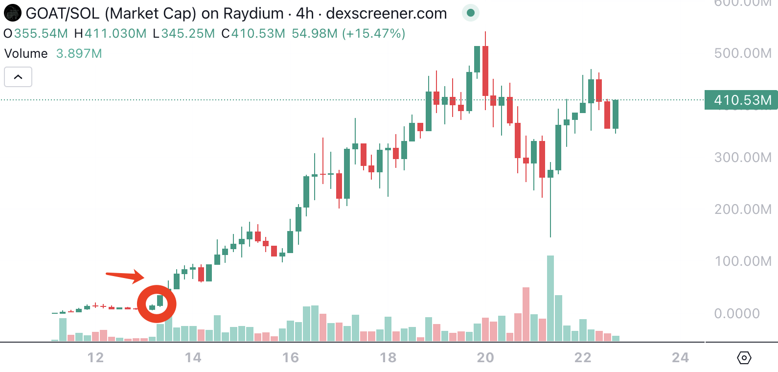 上周,AI meme 币爆火,跑出了市值超 5 亿美元的$GOAT。相关阅读见《GOAT 爆火背后,AI meme 的炒作预期和隐忧|100x 复盘》,Moonshot 在 GOAT 交易量突增、从底部启动爬升时宣布上线该币,陪伴 GOAT 从市值不到 4000 万美元走到 5 亿美元,也市场再一次见证了 Moonshot 的「魔法」。