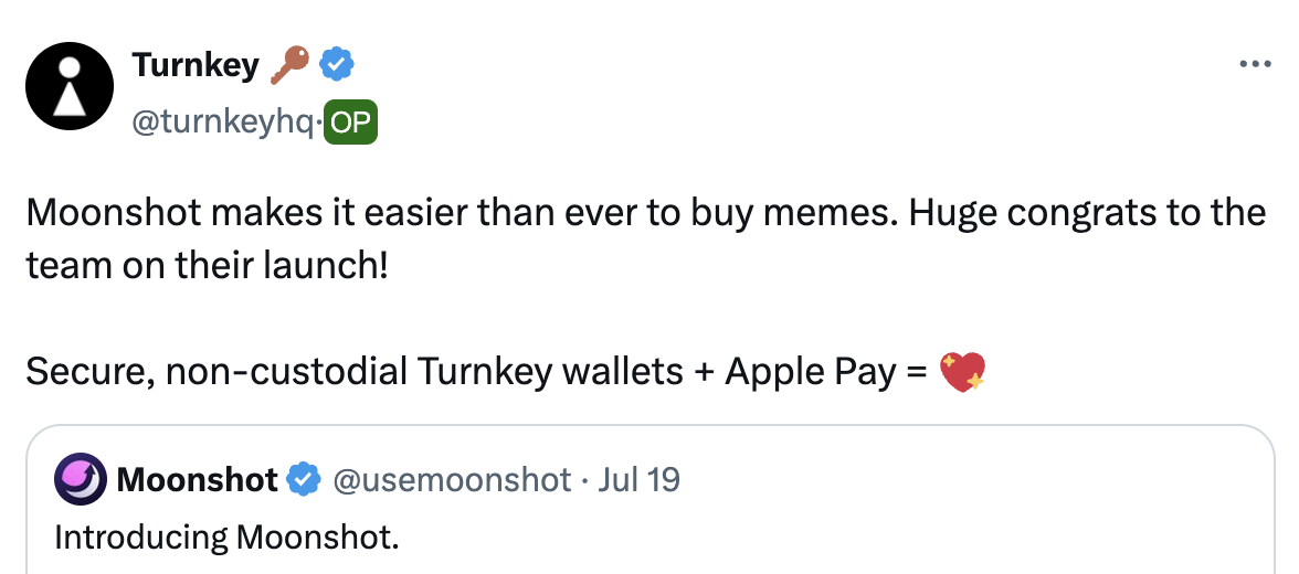 除了 MoonPay 之外,非托管钱包 Turnkey 也是 Moonshot 的合作伙伴。在 TrunKey 发布的文章中介绍,用户登录 Moonshot 后,Turnkey 会在后台创建一个非托管钱包,用户只需使用电子邮件或生物识别技术(例如面容 ID)进行注册后即可轻松验证交易。