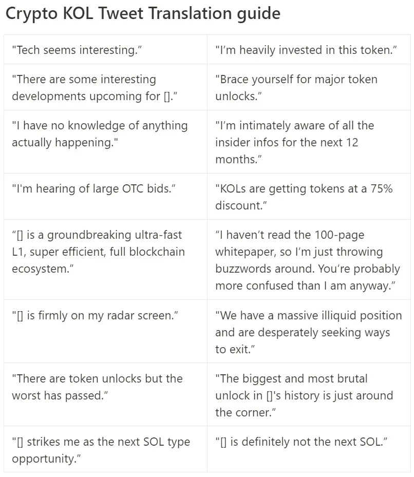 · OTC「融资」:OTC「融资」很常见,本质上也不一定是坏事,但由于条款通常不会公布,这些交易往往会造成较大的不透明性。这其中最臭名昭著的当属所谓的「KOL 轮」,它会被视作代币价格的短期催化剂,某些头部 Layer 1(我不想透露名字)最近也采用了这种策略——KOL 能够以较大的折扣(约 50%)和较短的锁定周期(六个月线性解锁)认购代币,出于利益考虑他们会努力将 xxx 营销为下一个 xxx(这里可自行带入某 Layer 1)杀手。如果你有疑问的话,可以看看我之前发布的 KOL 话术翻译指南。