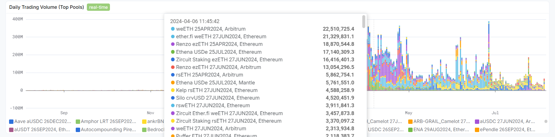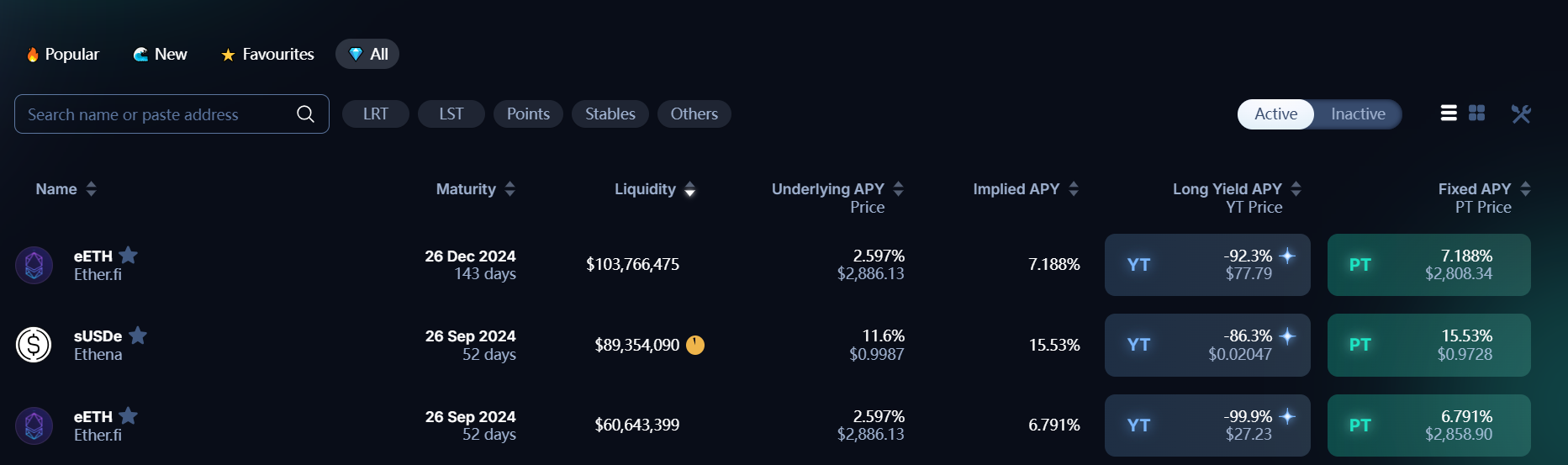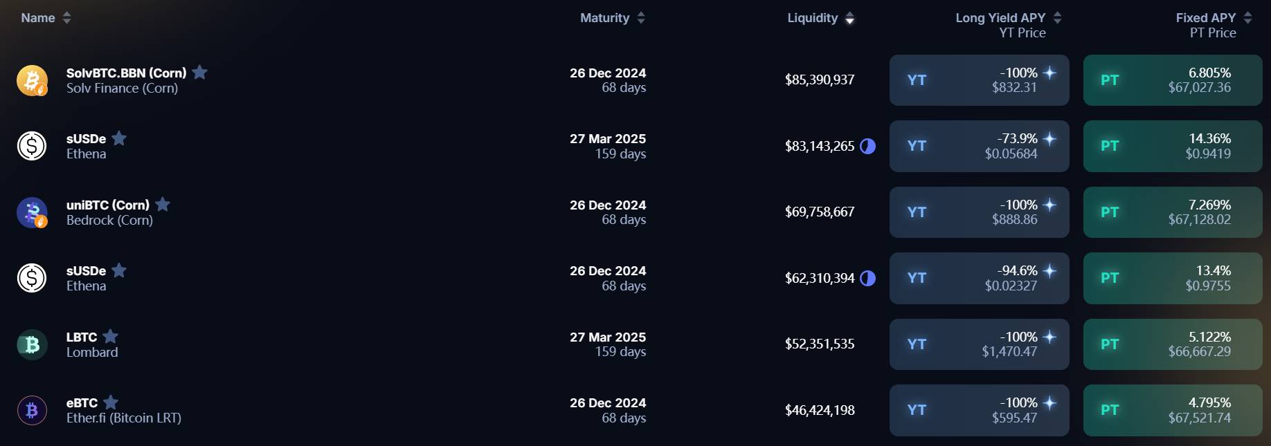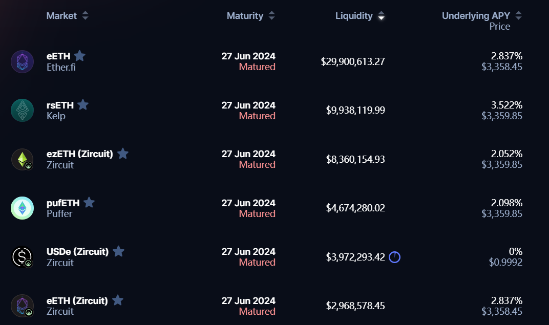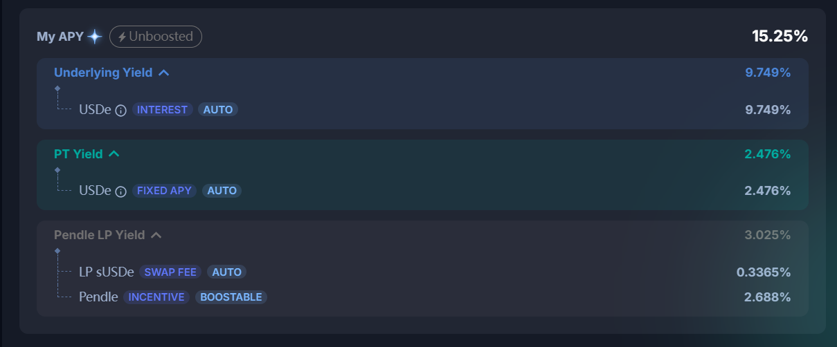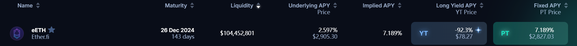 Long Yield APY:专门针对 YT 资产,在当前价格购买 YT 的年收益率,但这一收益率是不断在变化的,因为生息资产本身的收益率在变化(这个值有可能是负数,即当前的 YT 价格过高,导致超过了项目的未来收益)。值得注意的是,目前 Pendle 许多 YT 资产的潜在收益为空投和积分,价值无法估算,因此许多 YT 资产的 Long Yield APY 为 -100%。