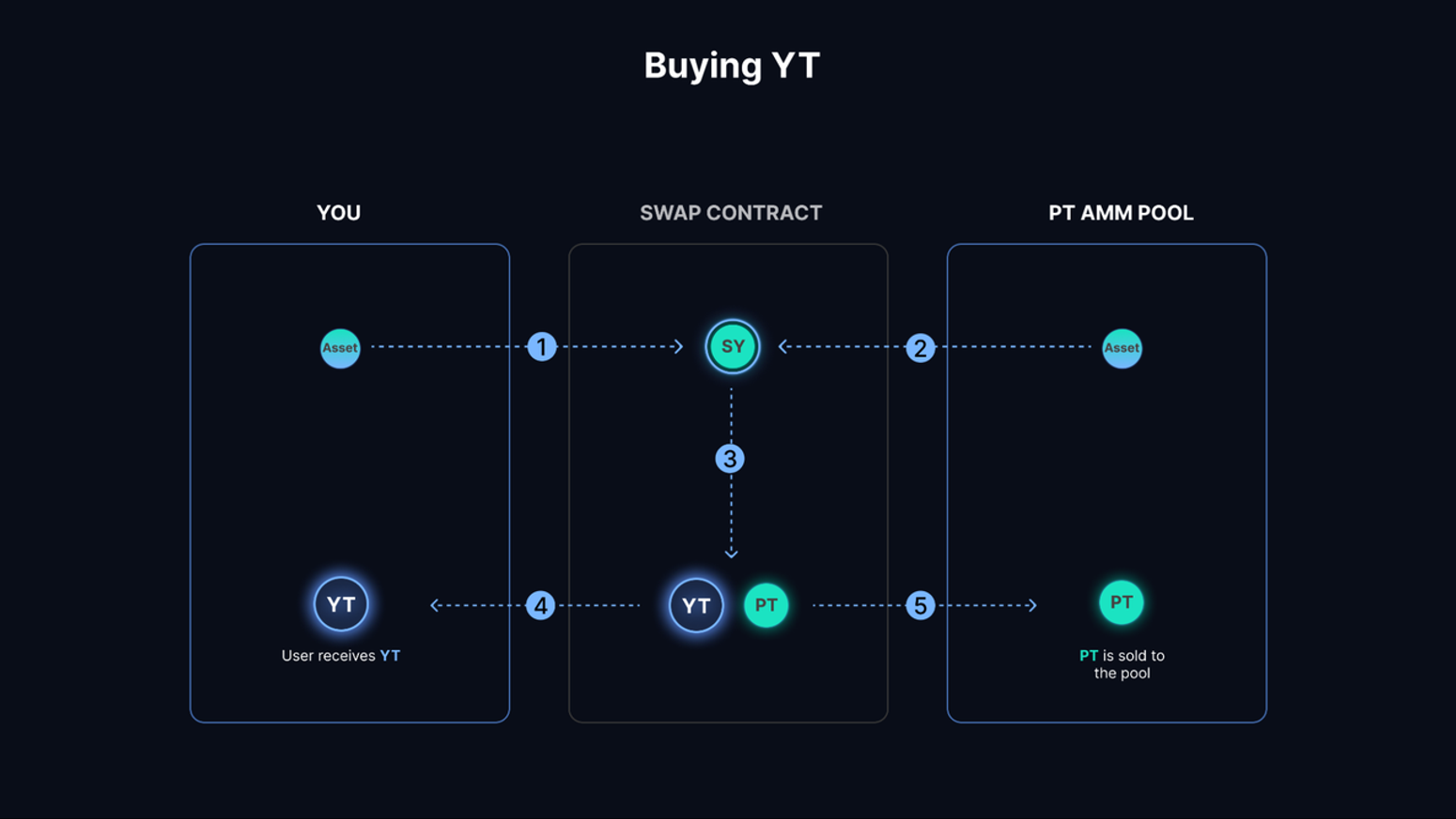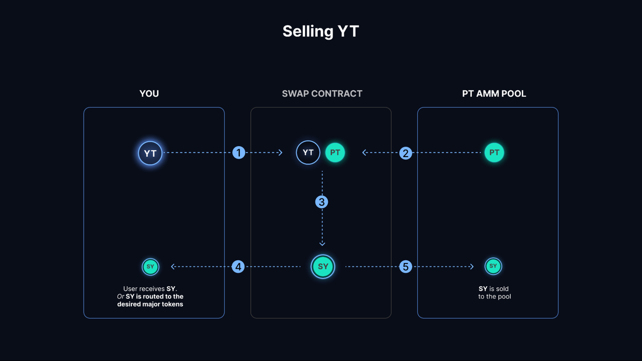 YT 持有者可以获得持有期间的该生息资产的全部收益,对应本金的收益权。如果收益是实时结算,那么持有 YT 可以随时领取已结算的收益,如果收益是到期后结算,用户只能在到期后凭 YT 领取收益,YT 对应的收益被领取完毕后,YT 资产将失效。购买 YT 的行为是一种 long yield 的行为,即认为该生息资产未来的收益率将会上升,获得的总收益将高于目前购买 YT 的价格。YT 为用户提供了一个收益杠杆,不需要购买完整的生息资产,就可以直接购买收益权,但如果收益率大幅下跌,YT 资产面临着亏本的问题,因此相比于 PT 资产,YT 是高风险、高收益的资产。