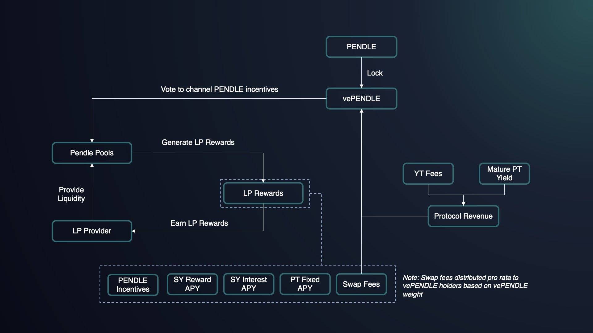 Pendle 是去中心化金融协议,允许用户将未来收益代币化并出售。在具体的业务流程上,协议将首先把生息代币包装成 SY 代币(Standardized Yield Tokens),该代币是 ERC-5115 标准下的代币,可以封装绝大部分的生息资产;之后,SY 代币被分割成两个部分,即 PT(Principal Token)和 YT(Yield Token),分别代表生息资产的本金和收益部分。