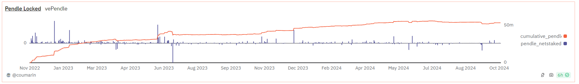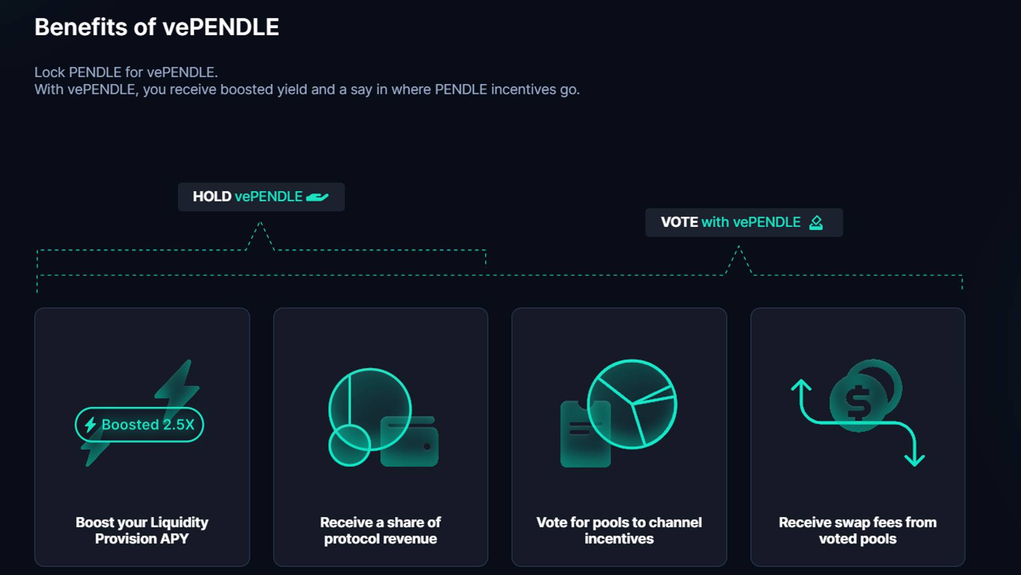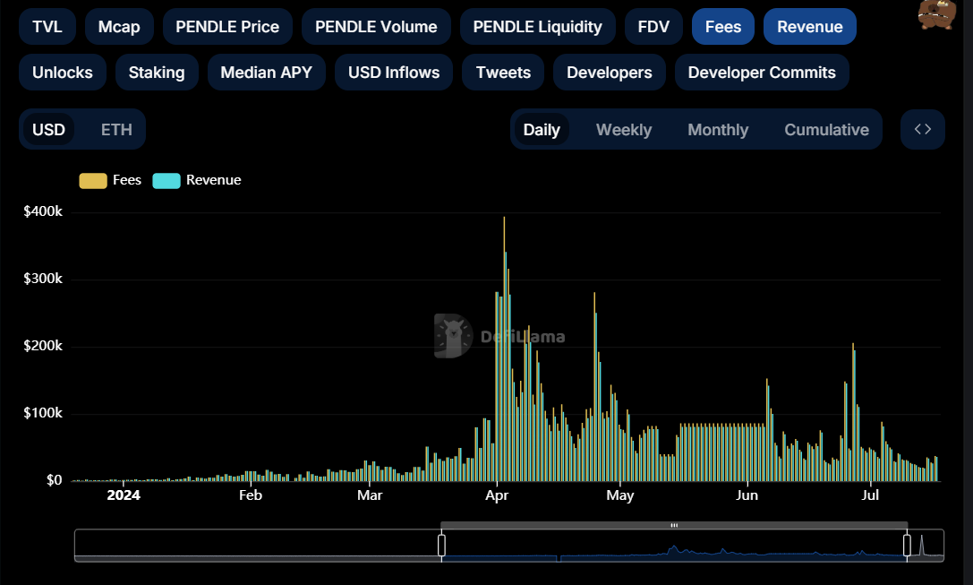 这四个收益率在 Pendle Market 的界面都会同时给出,当 Underlying APY>Implied APY 时,说明持有该资产的收益将大于持有 PT 的收益,此时可以采用做多收益率的策略,即买入 YT、卖出 PT,当 Underlying APY Pendle AMM 用来实现 SY、PT 和 YT 代币之间的交易。根据 Pendle 白皮书,在 V2 版本中,Pendle 改进了 AMM 机制,借鉴了 Notonial Finance 的 AMM 模型,提高了资金效率,降低了滑点。市面上固收类协议的三种 AMM 模型的图示如下,其中 X 轴是指 PT 资产在池子中的比例,纵轴为 Implied Interest Rate,目前 Pendle 采用的是红色曲线对应的 AMM 模型,黑色曲线为 V1 模型,蓝色曲线为其他固收类协议的 AMM 模型。 在具体的池子中,Pendle V2 采用了 PT-SY 的交易对,例如 PT-stETH 和 SY-stETH,可以大大降低 LP 的无常损失(后面会进行详细分析)。由于 SY=PT+YT,因此可以通过 Flash Swap 的方式实现 YT 的兑换,具体的流程如下。如用户需要购买价值 1ETH 的 YT-stETH,即需要实现 ETH 到 YT-stETH 的兑换。假设 1ETH=N YT-stETH,合约将从池子中借出 N-1 个 SY-stETH,并将用户的 ETH 转化为 SY-stETH(具体的过程是,先将 ETH 通过 Kyberswap 兑换成 stETH,然后在协议内封装为 SY-stETH),然后将所有的 SY-stETH(N 个)拆分为 PT 和 YT,把适当数量的(在本例中为 N)YT 给用户,然后将 PT(N 个)归还给池子,在池子中实际完成的是 SY-PT(N-1 个 SY 兑换成了 N 个 PT)的兑换。 卖出 YT 的流程则相反。如果用户想要卖出 N 个 YT(假设 N 个 YT 此时的价值为 1 个 SY),合约将从池子中借出 N 个 PT,将其合并为 N 个 SY,并将一个 SY 给用户,N-1 个 SY 归还给池子,此时在池子中实际完成的是 PT-SY 的(N 个 PT 被兑换成了 N-1 个 SY)兑换。 和其他的 AMM 一样,Pendle AMM 同样需要 LP 为池子提供流动性,但由于在到期日,一个 PT 一定等于一个 SY,因此在到期日的时候,LP 不存在无常损失。用户在提供流动性时,提供的资产为 SY 和 PT 资产,因此将自动捕获这部分资产的原生收益,此外还包括交易费和 PENDLE 的流动性挖矿奖励,即包括四项收益来源: PT fixed yield:购买 PT 本身的收益 Underlying yield:即 SY 资产的收益 Swap fees:交易费的 20% PENDLE 代币激励 PENDLE 的代币经济机制主要在于锁仓获取 vePENDLE 后,所能参与的协议分成和决策治理。类似于 Curve 的 veCRV 模型,用户可以将 PENDLE 进行锁仓以换取 vePENDLE,锁仓时间越长,获得的 vePENDLE 的数量越多,锁仓时间从 1 周到 2 年不等。 持有 vePENDLE 的好处包括: Boost 收益:可以对自己作为 LP 的收益进行 Boost,最高额度为 2.5 倍 投票权:对 PENDLE 激励在不同池子中的分配进行投票 收益分成:vePENDLE 的持有者可以获得以下收益: 所投票池子内 80% 的交易费分成:vePENDLE 持有者对 PENDLE 激励的流向进行投票,只有完成投票才能获得所选交易池的奖励 所有 YT 收益的 3% 一部分 PT 的收益:这部分来源于未赎回的 PT,例如⼀个用户购买了 PT 资产,到期时没有赎回,经过⼀段时间后这部分资产被协议获取 在收益率的计算上,持有 vePENDLE 的 Total APY=Base APY+Voter’s APY,其中 Base APY 来自 YT 和 PT 的收益,Voter’s APY 来源于指定池子的交易费分成,也是构成 APY 的主要部分——目前 Base APY 仅为 2% 左右,而 Voter’s APY 可高达 30% 及以上。 Pendle 的 ve 模型同样促进了贿选平台的诞生,Penpie 和 Equilibria 都在从事相关的业务,类似于 Convex 与 Curve 之间的业务过程。但相比于 Curve,在 Pendle 上所交易资产的核心项目方并没有贿选的需求,Curve 作为稳定币和其他锚定资产的主要交易平台,保证池子的深度对维持币价的锚定具有重要意义,这促使项目方有极大的需求来参与贿选引导流动性,但保持 Pendle AMM 的交易深度似乎对 LSD 和 LRT 等相关项目方来说没有太多意义,因此参与贿选的主要动力将来源于 Pendle 上的 LP。贿选平台的建立主要优化了两方面的问题:1)Pendle LP 可以不用购买和锁定 PENDLE 来获得更高的收益;2)PENDLE 的持有者可以获得具有流动性的 ePEDNLE/mPENDLE,以获得 vePENDLE 的激励。由于本文仅对 Pendle 进行分析,因此在此处不对贿选生态进行过多展开。 PENDLE 代币于 2021 年 4 月推出,采用混合通胀模型,代币供应无上限,在前 26 周内提供每周 120 万个 PENDLE 的稳定激励,之后(27 周 -260 周),流动性激励将每周衰减 1%,直到第 260 周,此后(261 周以后),通胀率为每年 2%,用于激励。 根据 Token Unlock 数据,初始代币分配给予团队、生态系统、投资者、顾问等,目前全部代币已经完成解锁,如果不考虑 OTC 交易,仅考虑初始分配,PENDLE 未来不会面临大额集中解锁。目前每日通胀仅来自于流动性挖矿激励,每日排放数量约为 34.1k 的 PEDNLE,根据 8 月 5 日币价($2),每日解锁抛压为 $68.2k,抛压比较小。 Pendle 的发展大致可分为三个阶段: Pendle 成立于 2021 年,彼时虽然正值 DeFi Summer,但 DeFi 处于基建期,主要项目围绕着 DEX、稳定币和借贷三大件进行,作为利率交换产品并未得到太多的关注。 直到 2022 年末,随着以太坊完成向 PoS 的转变,以太坊质押利率成为了币圈的原生利率,一众 LSD 资产快速涌现,这造成:(1)利率成为了币圈的关注重点之一;(2)大量生息资产诞生,Pendle 找到了自己的 PMF;(3)Pendle 成为炒作 LSD 赛道的小市值标的,且细分赛道内竞品较少。这一时期上线 Binance 进一步提高了 Pendle 的估值上限。 2023 年末至 2024 年初,Eigenlayer 开启以太坊的再质押叙事,一众流动性再质押(LRT)项目纷纷诞生,Eigenlayer 和 LRT 项目均宣布了积分和空投计划,积分大战一触即发