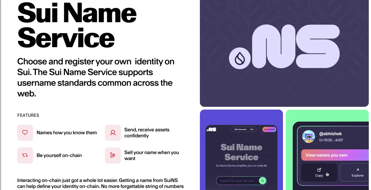 SuiNS 是 Sui 上的数字身份协议 ,你可以将头像链接到域名并创建 IPFS 网站。同时,SuiNS 用 @ 符号来替代 .sui 的传统 Web3 域名表现形式,如用 @google 来替代 google.sui,利于简化用户认知和推广子域名的采用,如 google 公司可在购买 @google 后向用户分发 user1@google、user2@google 的子域名。