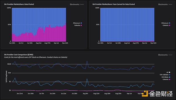 据 Blockwork Research 数据显示,截止 9 月中旬,其数据发布比例就已创下 57%,其产生费用仅 243 美元,为以太坊主网费用的 1%。自主网启动以来,Celestia 已支持 20 多个 Rollups 部署。