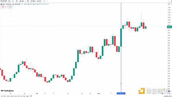 市场价格表现当日不跌反而暴涨 16.55%,一度冲至 10 美元附近。10 月 22 日,APT 币价升跃 11 美元上方,创下 2024 年 5 月份以来新高。