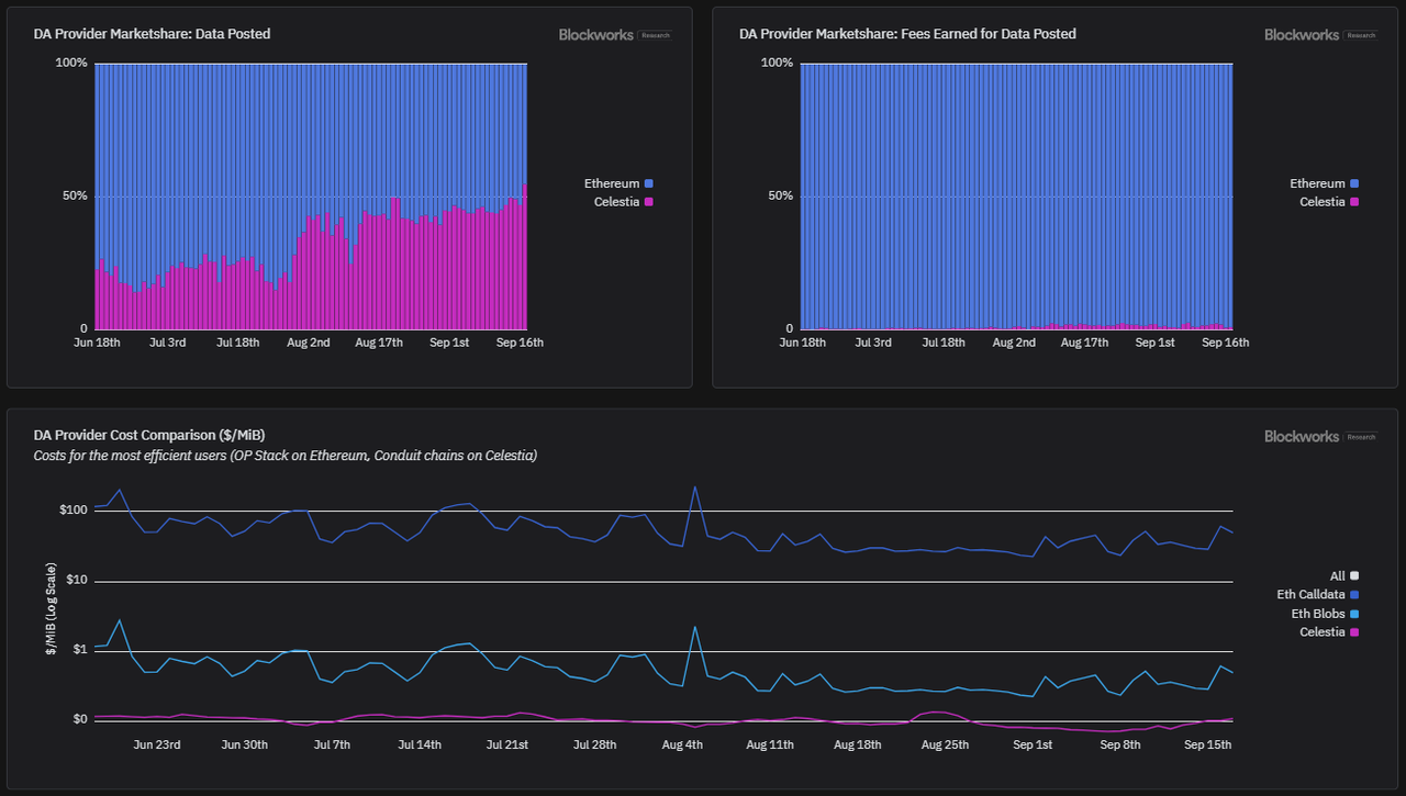 据 Blockwork Research 数据显示,截止 9 月中旬,其数据发布比例就已创下 57%,其产生费用仅 243 美元,为以太坊主网费用的 1%。自主网启动以来,Celestia 已支持 20 多个 Rollups 部署。