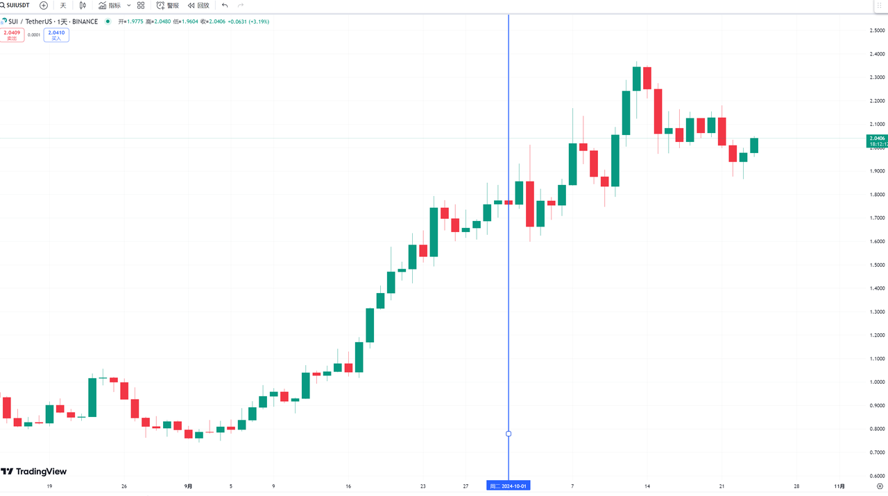 不过 SUI 并未出现大幅波动,当日从 1.93 美元跌至 1.65 美元,跌幅仅 0.97%。虽然后续也有部分回调,但价格走势却极其强劲,在解锁后的一周后,即 10 月 13 日,甚至创下了 2.368 美元的历史新高。