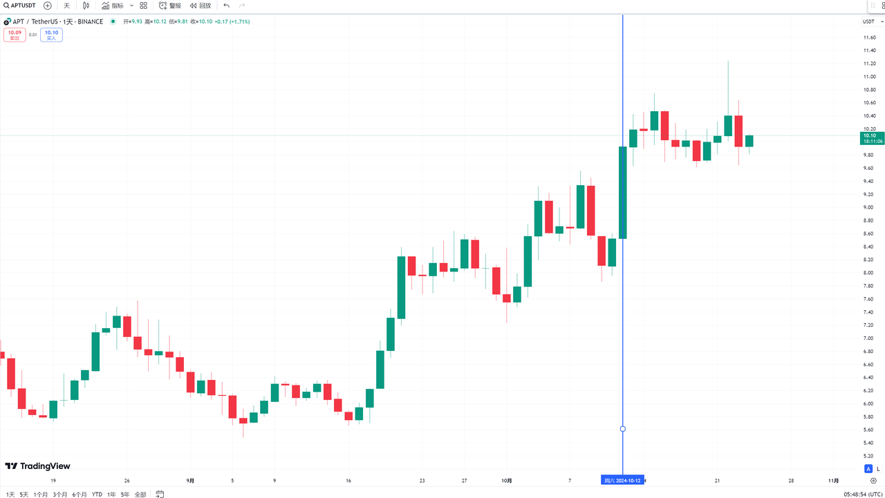 市场价格表现当日不跌反而暴涨 16.55%,一度冲至 10 美元附近。10 月 22 日,APT 币价升跃 11 美元上方,创下 2024 年 5 月份以来新高。