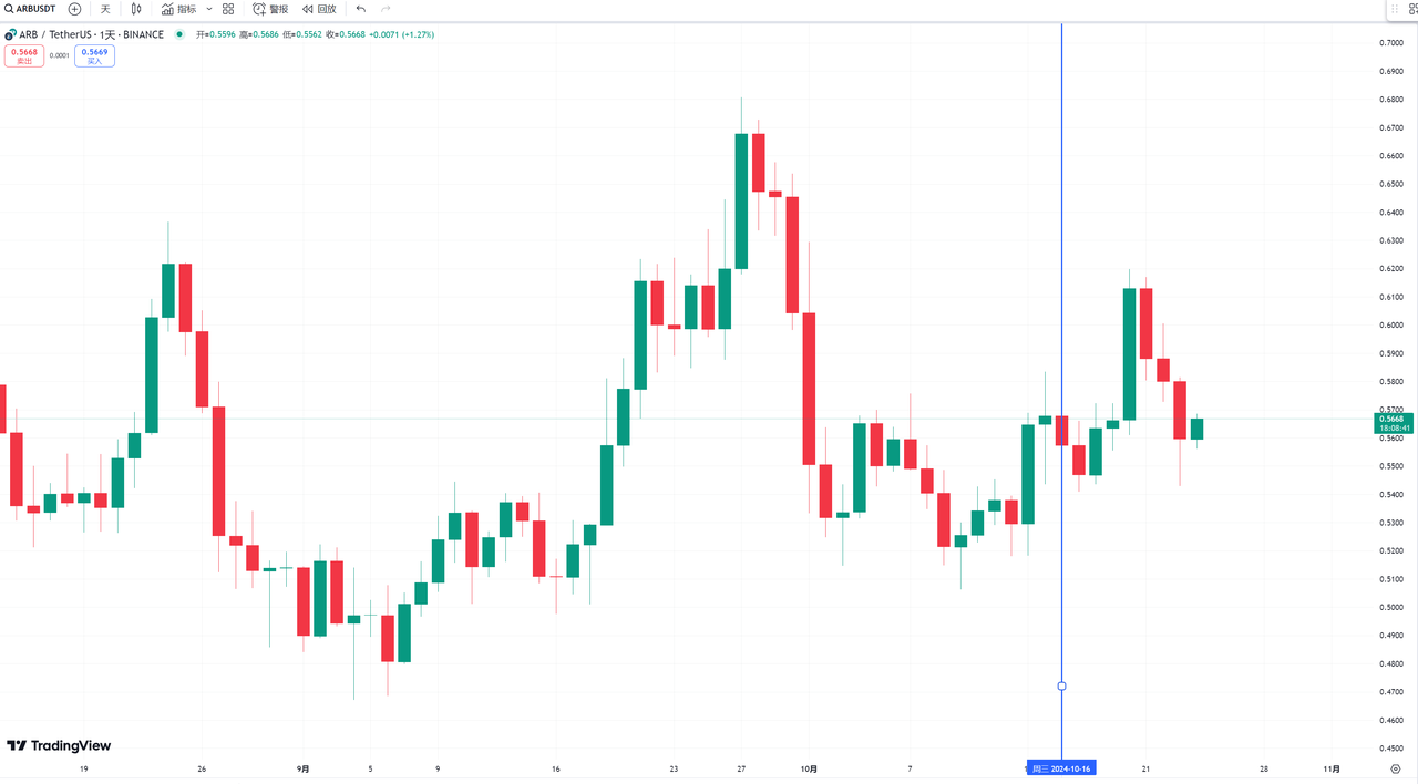 解锁当日以及次日,ARB 迎来共计 3.7% 左右的下跌幅,从 0.58 美元跌至 0.54 美元,很快后续三连涨币价上涨至 0.6 美元上方。