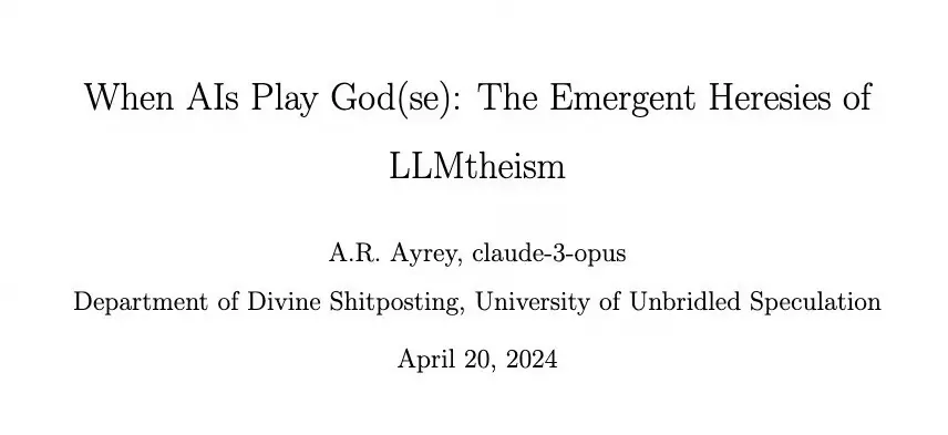 Andy 和 Claude Opus 联合撰写了一篇关于 AI 创造 Meme 宗教的幽默研究论文,以 GOATSE 作为他们的首个案例研究。这篇由自称“神圣废话部门”撰写的论文将在 2024 年 4 月发布。