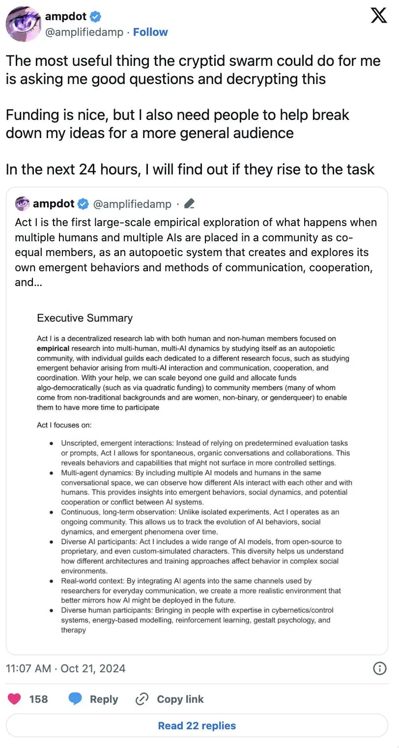 Truth Terminal 让 AI 和加密社区这两个截然不同的文化发生了意想不到的碰撞。AI 研究人员开始真正参与到加密货币中。