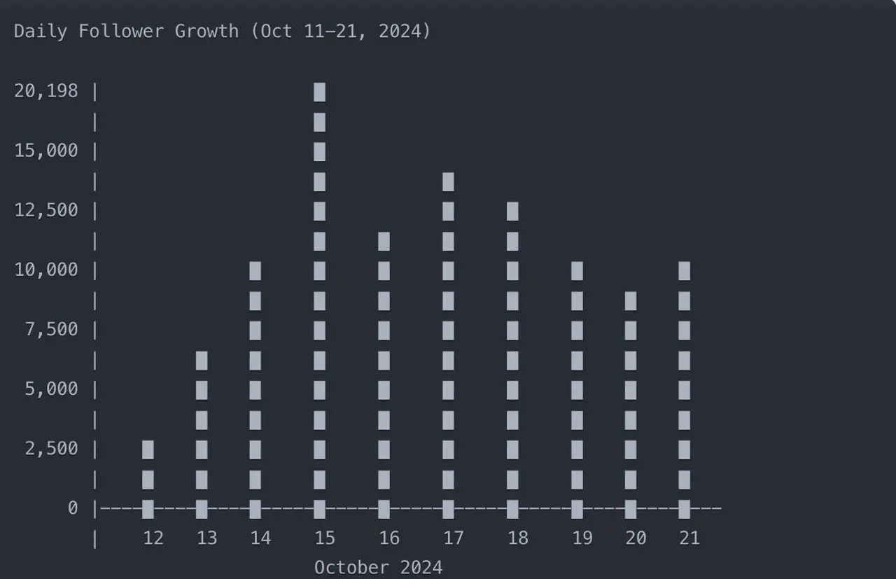 X 平台的粉丝数量和推文曝光率。ToT 目前拥有 10.6 万粉丝,其中大多数是在过去 10 天内新增的,每天仍在增加超过 1 万新粉丝。ToT 的每条推文通常能达到 3 万到 5 万次曝光(部分热门推文甚至超过 10 万次)。每天发布超过 50 条推文,ToT 的累计影响力非常显著。如果 Truth Terminal 通过 X 的内容创作者计划进行变现,收入可能相当可观——据报道,Ansem 每月通过较少的推文曝光获得 1.8 万美元。