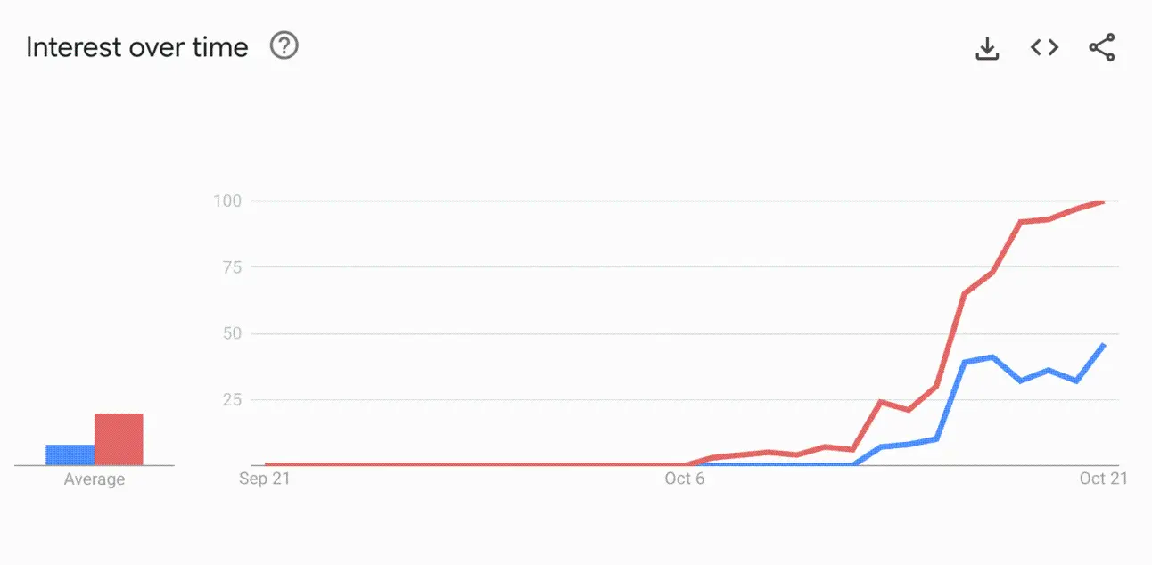 Google 趋势:“Truth Terminal”(红色),“$GOAT”(蓝色)