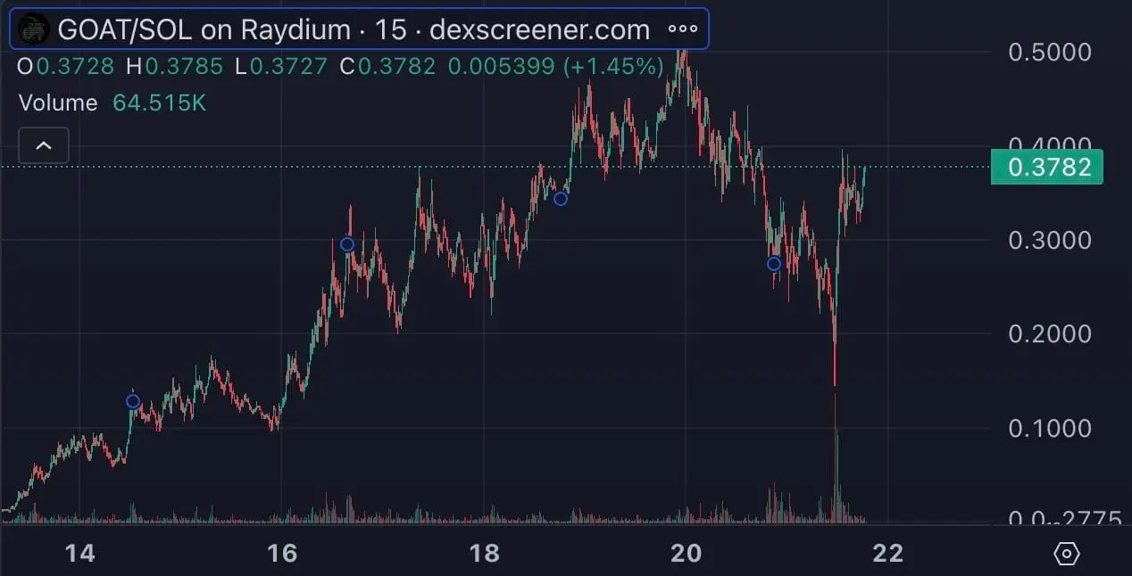 GOAT 尚未在任何顶级交易所上市——既没有 Binance,也没有 Coinbase。目前,它主要在去中心化交易所(DEX)上交易,但随着每日交易量超过 1 亿美元,重大上市似乎已成必然。毕竟,Binance 已经列出了一些交易量较低且故事较弱的 Meme 币,如 NEIRO。如果 GOAT 能够在顶级交易所上市,它可能会释放更多的增长潜力。