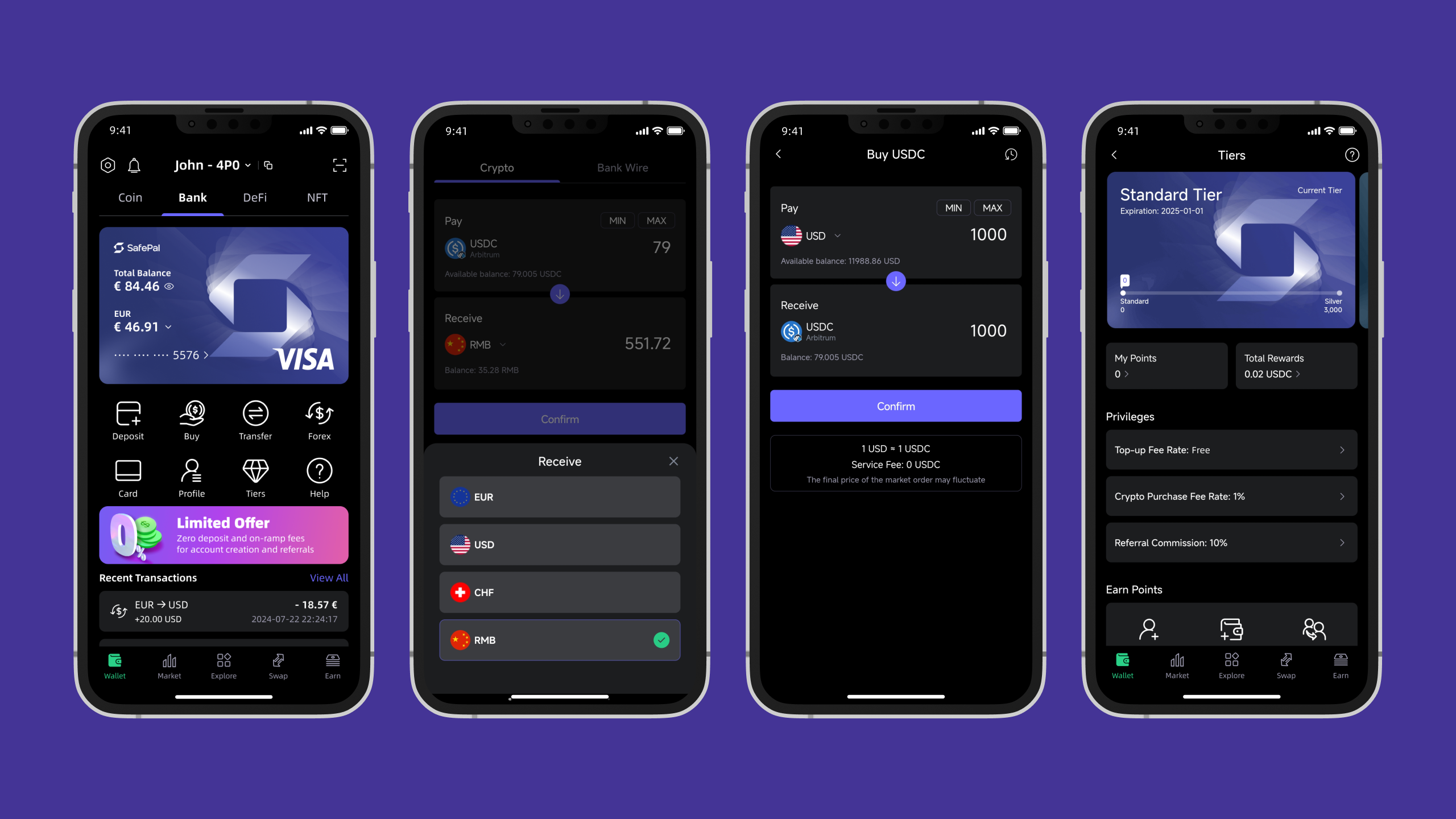 除了常规的银行转账功能外,SafePal App 内的银行账户还支持合规的法币出入金服务。这意味着用户可以存入 USDC 等稳定币,自动转换为美元、欧元、离岸人民币等法币,反之亦然。这一功能让用户能够轻松在加密资产和法定货币之间切换,以完全合规的方式打破了这两类资产之间长期存在的次元壁,进一步提升了 SafePal 银行通道的可用性和便利性。