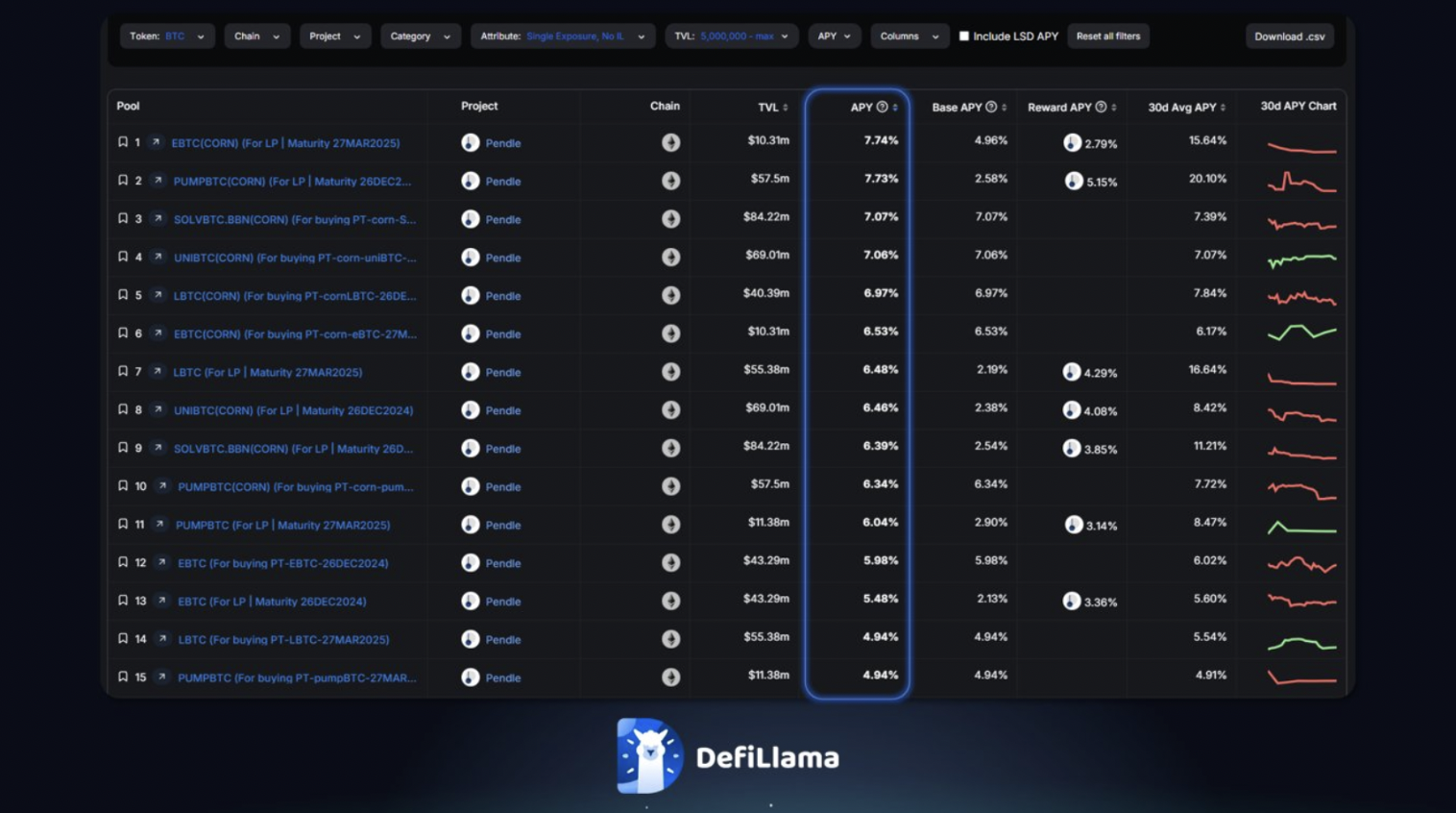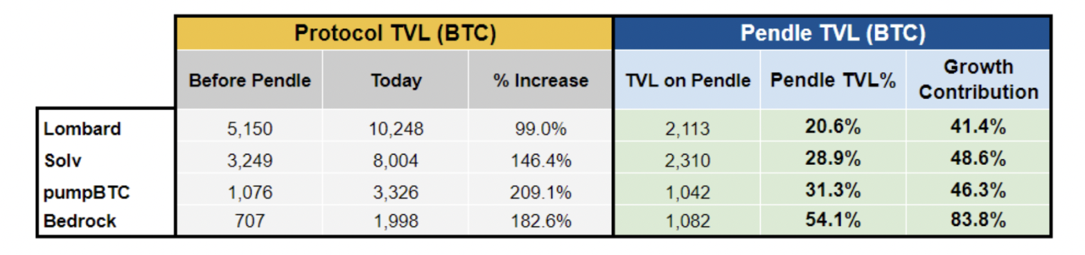 Pendle 目前占据了 BTCfi 总 TVL 的三分之一以上,推动了多个 BTCfi 协议的增长,如 Lombard、Solv Protocol、Bedrock、pumpBTC 和 Corn 等。