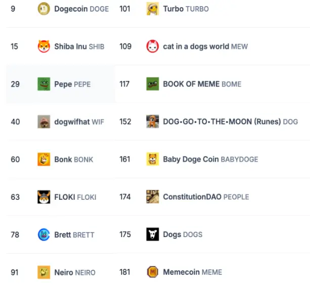BRETT,MEW,DOG是剩下3个主宰率较高的代币,也都在最近实现的形态转变或者突破。BRETT在5个月的下降通道中实现突破,MEW在7个月的下降通道中实现突破,但是由于他们的流动性不在主流交易所中,突破后的走势和上文列出的Memecoin相比不算强势。DOG突破后,保持了一个月的上升通道。