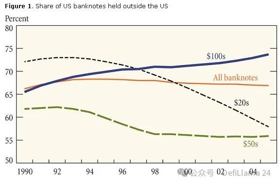 近 75% 的实物 100 美元钞票都存放在海外,价值超过 1.5 万亿美元。现在,人们可以通过稳定币以数字形式全天候 24/7/365 地获取任何数量的美元或其他货币。