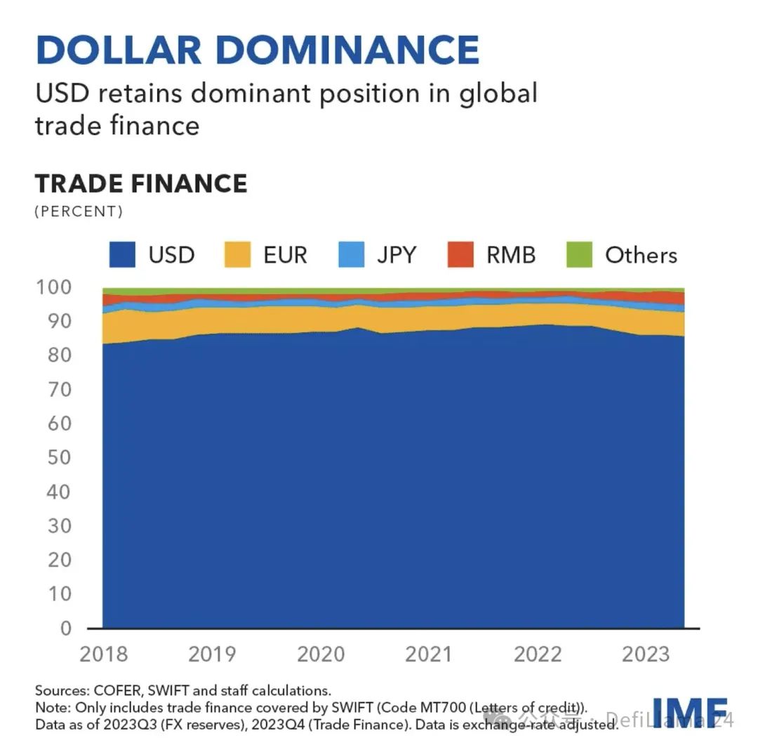 根据 SWIFT 的数据,由于大多数商品贸易继续以美元计价和结算,美元在贸易融资中占比超过 80%。