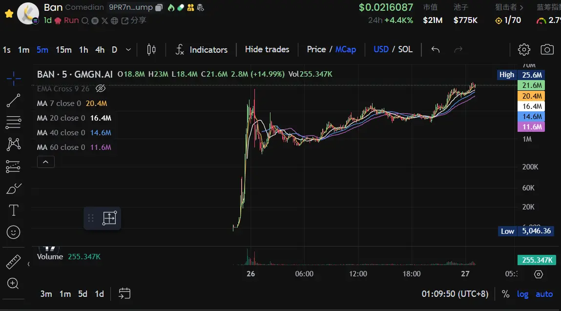 当时 $Ban 市值在 10 万美金左右,消息一出 $Ban 即刻拉升,一小时内市值最高达到 700 万美元附近,最高涨幅接近 70 倍。