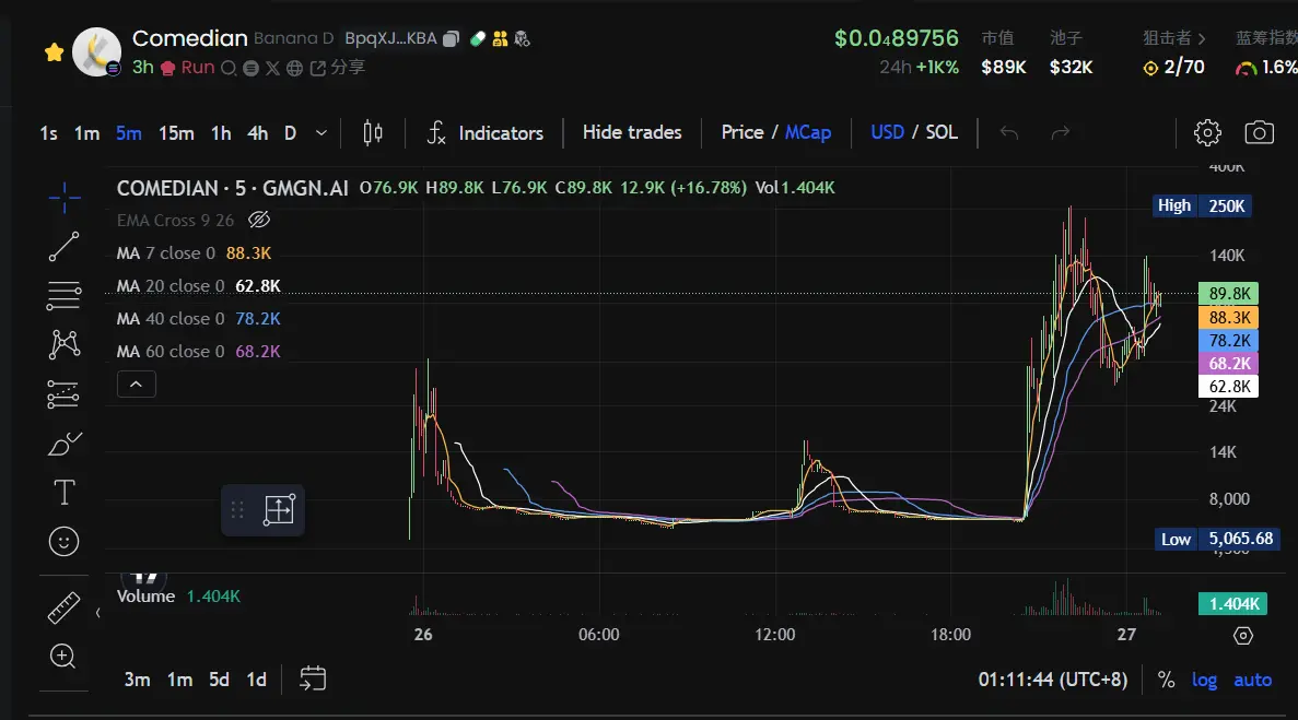 与龙一 $Ban 正好相反,这个代币以香蕉本名 Comedian 作为代币符号,角度看似正确,但从价格表现上看好像玩家们不太买单。