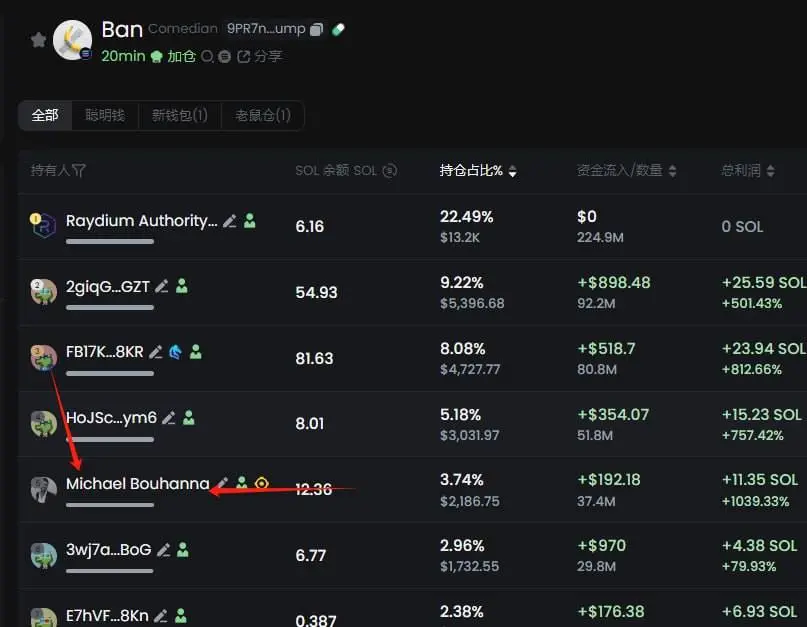 那这根香蕉怎么传染到 Meme 市场的?据小编的初印象,周五晚上十一点左右,有链上猎手提示 GMGN.AI 上显示 Solana 链上的香蕉概念币 $Ban 前排持仓之一是苏富比的副总裁 Michael Bouhanna(@michaelbouhanna),该持仓占比占总量的 3.78%。