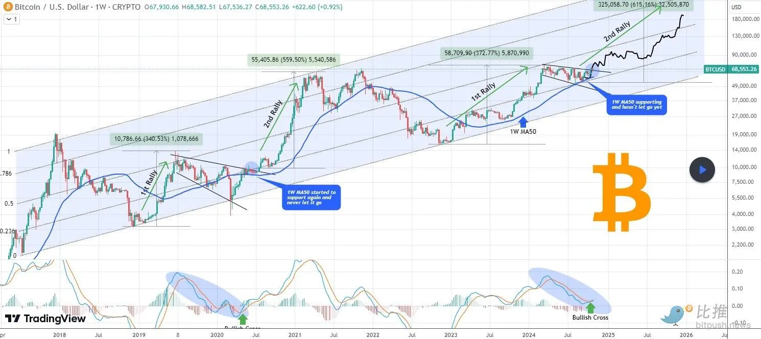 即便没有像年初比特币 ETF 推出这样的重大催化剂,若比特币能够重演 2022 年 11 月至 2024 年 3 月的牛市行情,达到 20 万美元的目标也并非天方夜谭。TradingShot 认为:「历史数据表明,只要周线级别的 K 线图未收于 50 周移动平均线下方,无论比特币价格攀升至 10 万、15 万还是 20 万美元,我们都可以保持乐观态度。」
