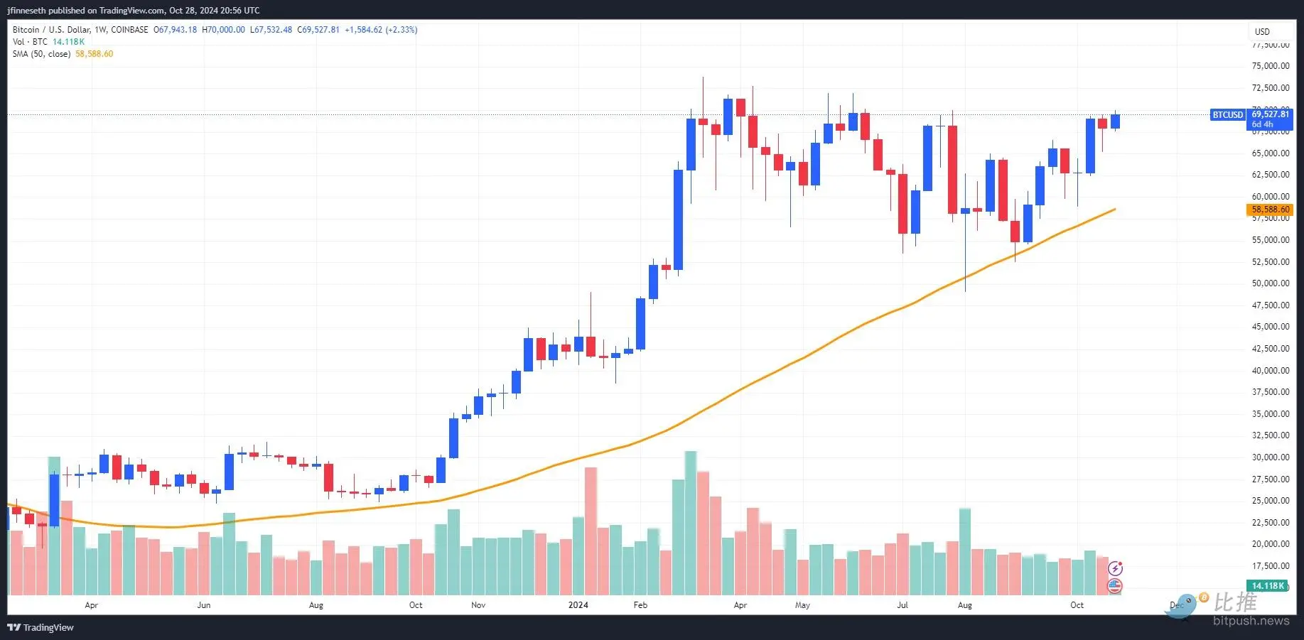分析师指出,比特币最近的上涨是因为它重新站上了 50 周移动平均线这个重要的支撑位。而且,历史数据显示,比特币的价格经常会受到 50 周移动平均线的影响。在过去的一段时间里,50 周移动平均线多次成为比特币价格的支撑位,这表明它是一个非常可靠的支撑。