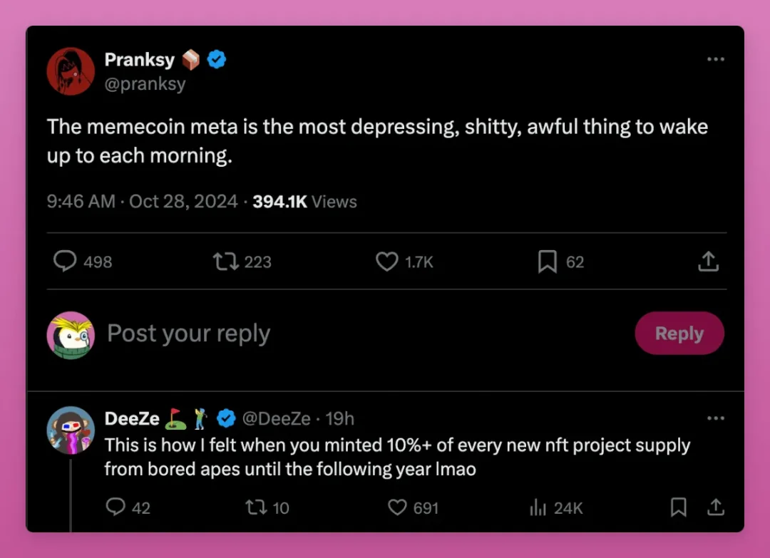 例如,曾经是顶级 NFT 玩家的 Pranksy 现在已完全跟不上 memecoin 的节奏。游戏玩法已经改变,但他仍坚持玩那种很少有人感兴趣的游戏。