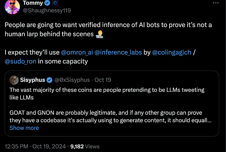 比如关于无法证明真理终端(Truth Terminal)到底是一个 AI 机器人还是作者操控的内容这一问题,可能可以通过加密解决方案,比如可验证的推理(verifiable inference)来解决。