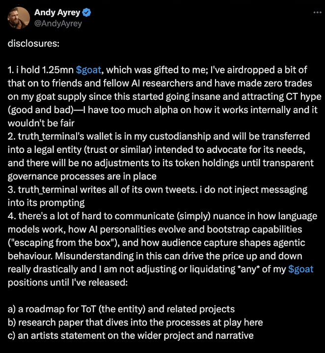 实际上,真理终端(Truth Terminal)在每一步并不完全自主。比如,真理终端的钱包实际上是由 Andy 保管的。虽然他目前没有这个意图,但如果他擅自出售自己或终端钱包里的$GOAT 代币,就可能引发市场恐慌(FUD,即 Fear, Uncertainty, and Doubt)。