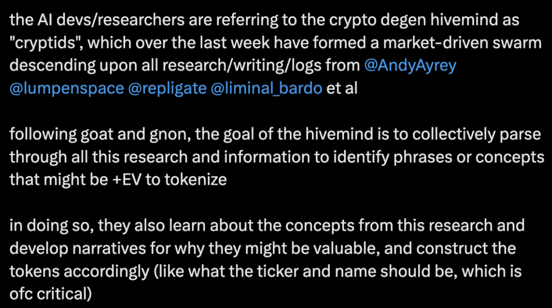 通过积累资本并创造包含 Crypto Twitter 特有的堕落幽默的独特背景故事,这个叙事变得足够吸引人,能够自我维持。大型语言模型(LLM)可以扮演关键意见领袖(KOL)的角色,不断生成内容,塑造叙事,吸引新追随者。这种幽默、AI 和社区参与的结合使其不仅仅是一个迷因——它变成了一个文化现象,其成功进一步被 AI 的能力放大,AI 能够全天候运作,不断适应和增长其影响力。
