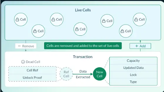 类似于BTC的 UTXO 模型,Cell 通过输入和输出来执行交易和状态更新每个 Cell 可以作为交易的输入被花费,并生成新的输出,创建新的 Cell