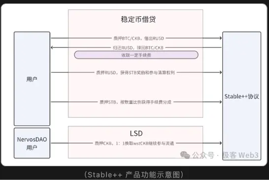 RGB++ 和 Stable++ 协同工作,Stable++ 通过超额抵押 BTC 或 CKB 生成 RUSD,然后通过RGB++在链上发行